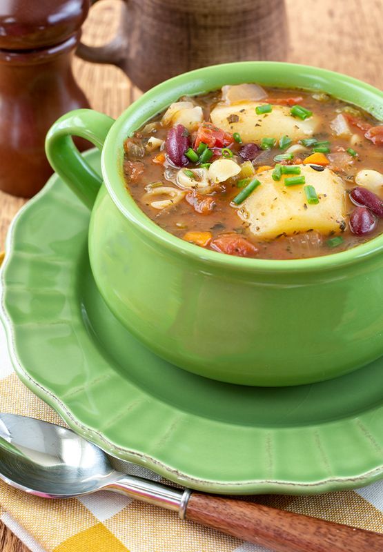 - After the soup has cooked for the required time, increase the heat to medium. Add the potatoes, and beans and allow it to cook for 20 minutes or until the potatoes are slightly soft. Add the pasta and cook for 15 minutes, or until the pasta is cooked. Serve immediately and top with freshly chopped chives.